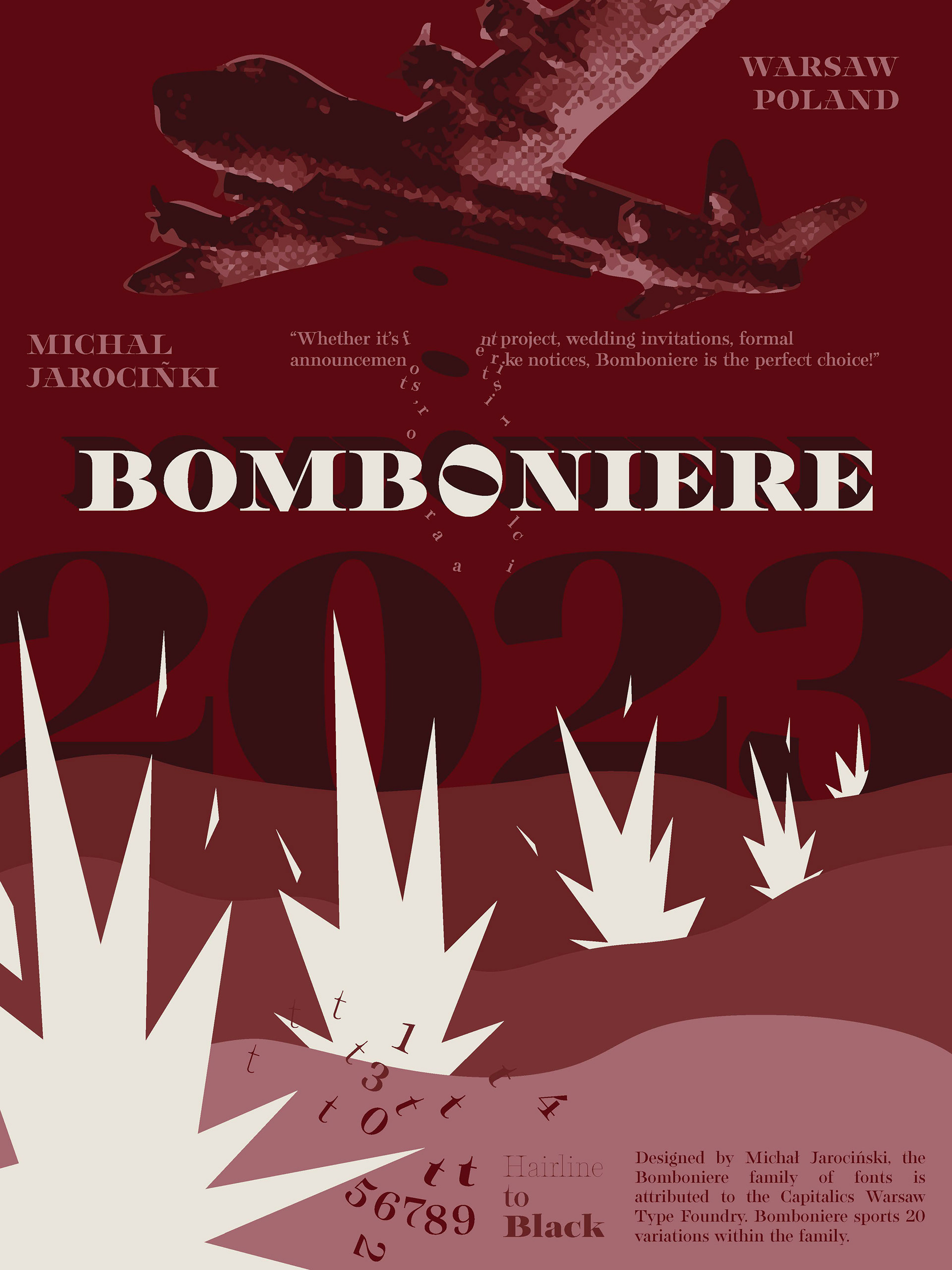 My "Bomboniere" poster design was an experimental approach to the traditional gridded style of typeface characteristic posters. I explored a font I found interesting and creative, and designed an avant-garde poster to demonstrate Bomboniere's bold presence (Spring 2025).